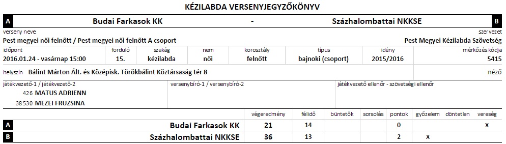 Budai Farkasok KK - Százhalombattai NKKSE 21-36 (14-13)